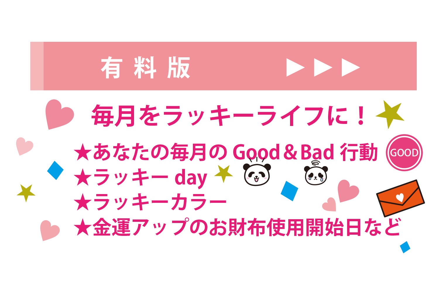 会員登録すると、毎月1日にChie先生のラキ☆カレ会員だけの開運メルマガが配信されます。 |