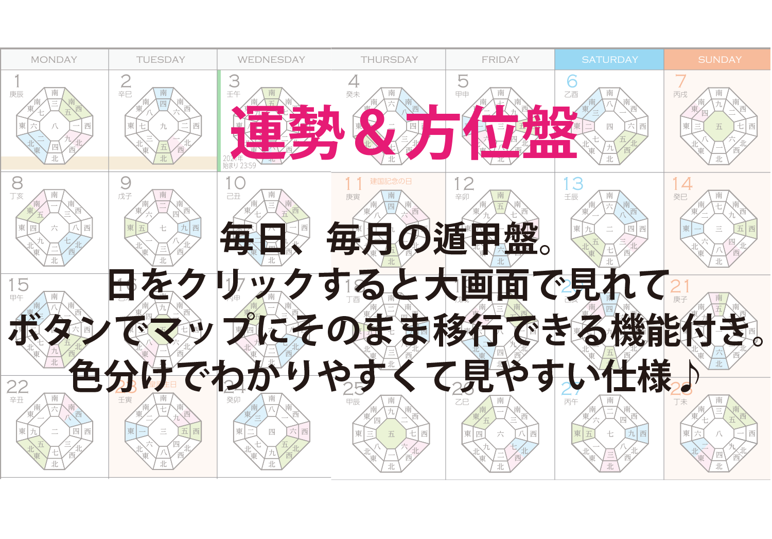 九星気学の「開運メソッド」と「吉方位マップ」に「スケジュール機能付きカレンダー」が一つになった『ラキ☆カレ』。
